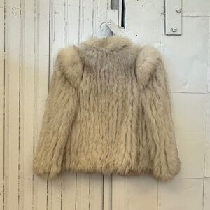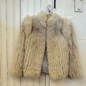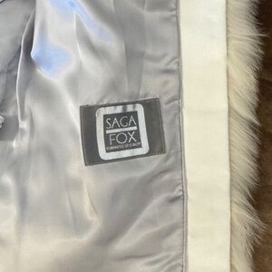 Why go FAUX when you can have FOX?This is a stunningly beautiful vintage Saga Blue Fox Fur jacket in a light grey on the tips and beige on inner fur. The interior is lined and there are side pockets. This beautiful 80s vintage blue fox jacket is in excellent gently used condition. There are no tears and the silver acetate lining is in excellent condition. Size Small.