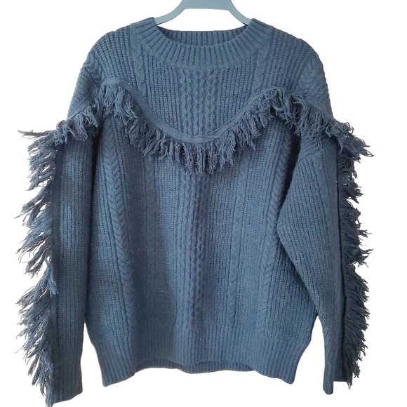 Avantlook Fringed Long Sleeve Cable knit Boho Crewneck Sweater Sz S Black Cozy