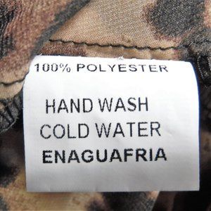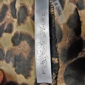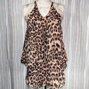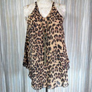 Size Large Sleeveless Leopard Print Top, Necklace attached to front. Sheer fabric double layered in the front, Rounded hem. Approximate measurements taken laying flat in inches: Armpit to armpit 20", Length 31"