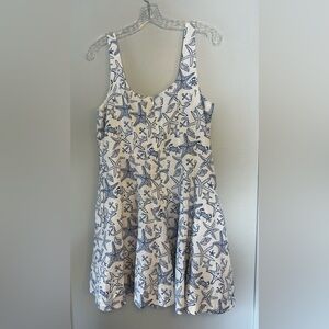 Avec Les Filles Blue White Print Fit & Flare Dress Square Neck Size 14 NWT