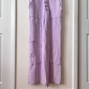 Introducing the 'Avec Les Filles Carpenter Jumpsuit', a stylish and trendy addition to your wardrobe. This jumpsuit in candy lilac features a button front closure and is made of 100% cotton for ultimate comfort. With an inseam of approximately 29 inches and a rise of 12.5 inches, this jumpsuit is perfect for any occasion.