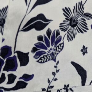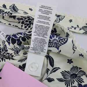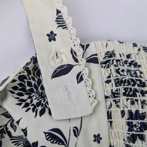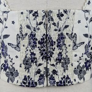 Square neckline with lace trim. Sleeveless. Adjustable shoulder straps. Cropped length. Exposed back zipper closure. Smocked at center back. Allover black and navy floral and butterfly print on natural background. Lined.