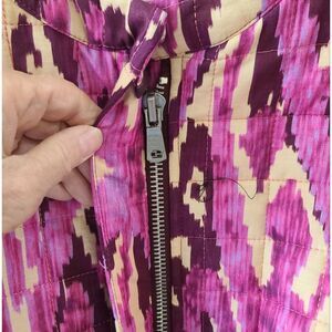 An ikat-inspired print brightens a lightweight quilted cotton jacket featuring gently puffed shoulders and drawstring waist ties for contemporary appeal.