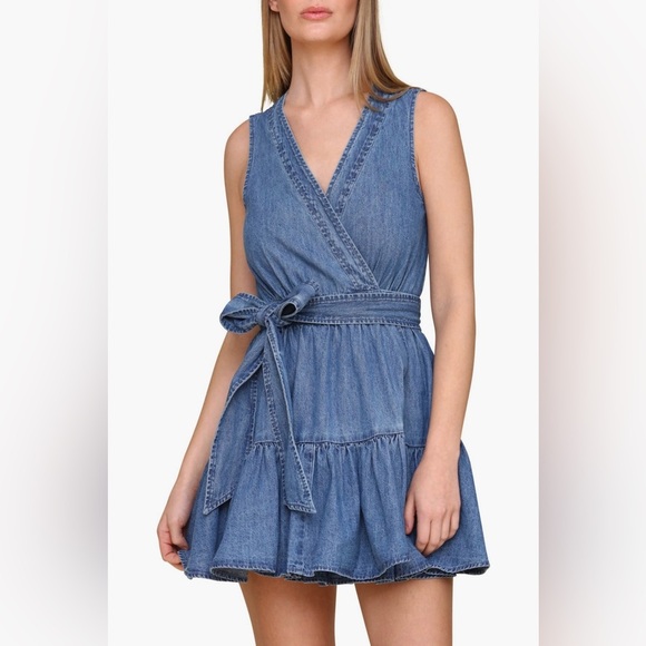 Avec Les Filles Denim Tie Waist Wrap Mini Dress NEW