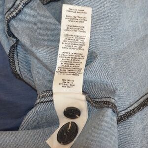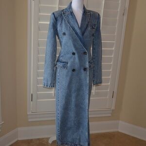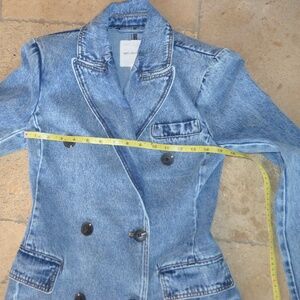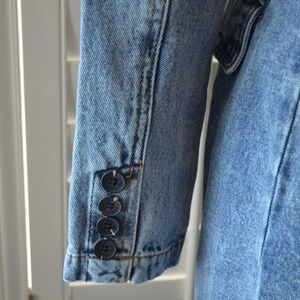 Medium Blue Wash. Double Breasted. Functional Side Pockets. US Size XS. Shoulder Pads. Some Stretch. Machine Wash Cold. No Flaws or Stains.