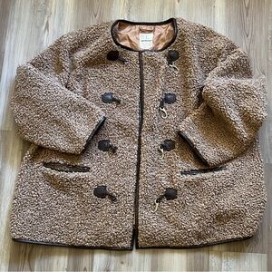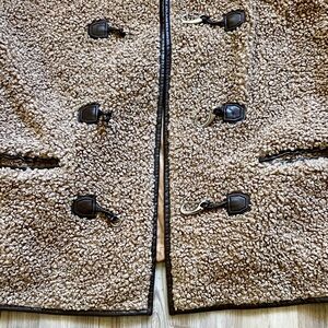 Sherpa coat with vegan leather trim. Toggle front closure, pockets, contrast hem. Will keep you warm & let you layer underneath