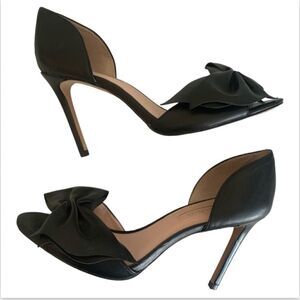 Avec Les Filles Jada Peep Toe Pumps in size 8.5. These black leather, round peep-toe, slip-on d'Orsay dress sandals are gently used and in great condition. They feature a bow detail at the toe cap and a 4" wrapped stiletto heel. The uppers are suede or leather with a manmade sole.