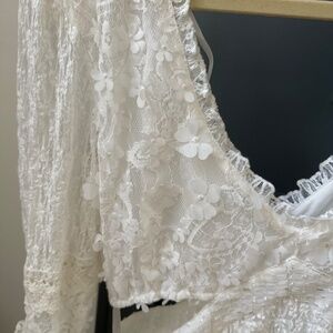Intricate lace lends ethereal glamour to our cut-out mini dress, which features a v-neckline, back zipper closure, and tactile ruffles on the sleeves and skirt.