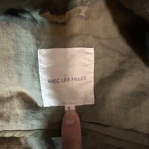 Elevate your wardrobe with this stylish military-inspired jacket from Avec Les Filles. Made from lightweight linen, it combines functionality and fashion with its structured design, olive-green hue, and versatile silhouette. Featuring button-front closure, utility pockets, and a flattering tailored fit, it's perfect for layering over casual or chic outfits. This jacket effortlessly blends timeless military style with modern sophistication. Size S fits true to size. Ideal for transitional seasons, it's a must-have addition to your collection.