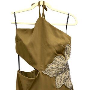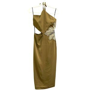 Avec Les Filles Olive Midi Dress Size 6 Beaded Floral Accent Halter Neck Cutout