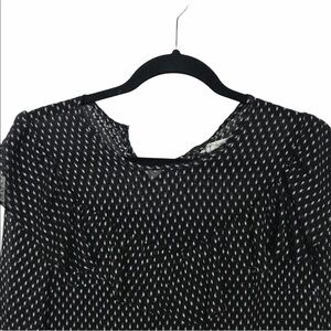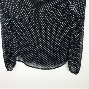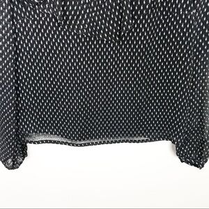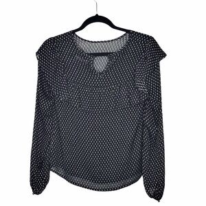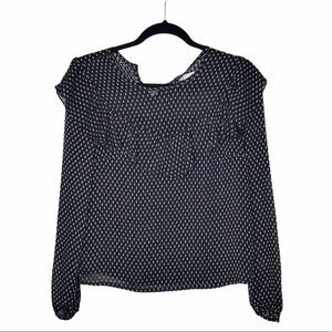 Black ruffle detail shirt with dot print throughout. Preowned—Has some fraying and is missing button on key hole closure on back but otherwise in good shape. It’s sheer but it is lined.