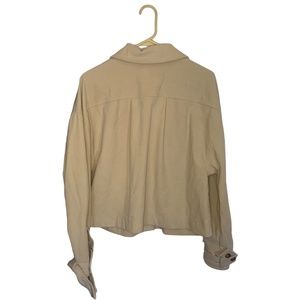 A corduroy style shacket that is on the thinner side, and includes breast pockets, a three button front closure and a collar. It also includes arm cuff button details. 100% polyester.