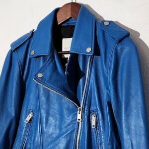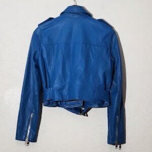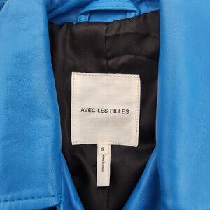 The Avec Les Filles Women's Cropped Genuine Leather Jacket in size Small is a stylish and versatile outerwear option for women. Made of high-quality leather with a solid pattern in a blue color, this short-length jacket features a zip closure, long sleeves, and a biker style design. The jacket is lined with polyester and includes accents like a buckle and zipper details. Designed for various occasions such as travel, parties, casual outings, and business meetings, this jacket is perfect for winter, fall, and spring seasons. Additionally, it offers a regular fit and includes zipped pockets for added functionality.