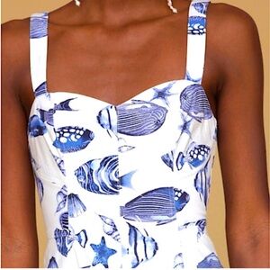 Avec Les Filles beachy feminine vacation midi dress with fish pattern.