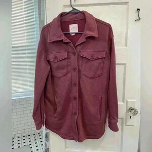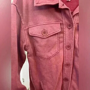Cute oversized shirt jacket, soft sweatshirt like feel, terry like interior.