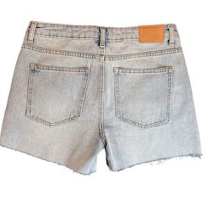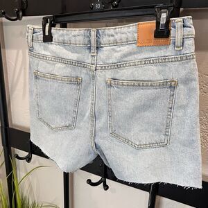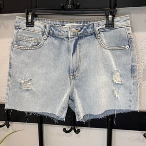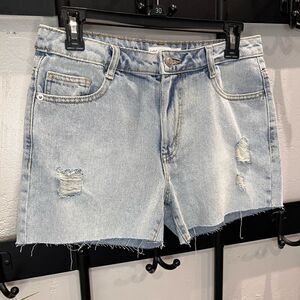 Light denim, distressed, cut offs, zipper fly, 5 pocket, belt loops.