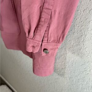 Chic pink utility jacket with front pockets. Button-up design with a classic collar. Perfect for layering. See similar styles in pictures. No notable flaws. May be missing belt sash, but honestly doesn't really need it.