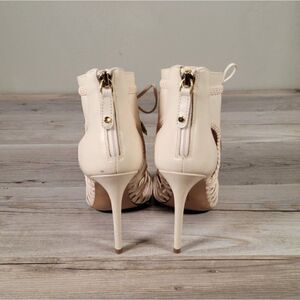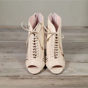 These blush pink lace up leather booties from Avec Les Filles have peek toes and beautiful details throughout. Zip up the back closure. 4" stiletto heels.