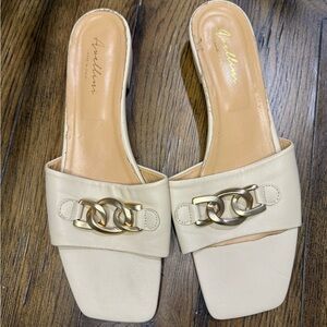 Step out in style with Aurelia's cream slide sandals, featuring a chic gold accent. Perfect for any occasion, these sandals offer both comfort and elegance.