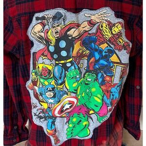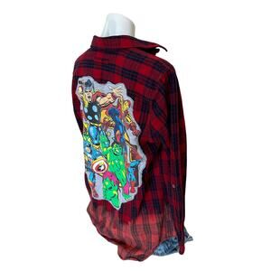 Avengers Plaid Flannel Shirt LARGE Oversize Upcycled Unique DC Comics Grunge