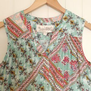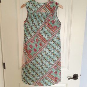 Very good pre-owned condition. Aventura Gia Sleeveless Shift Dress. Size Medium. 100% viscose. Machine wash. V-neck, curved hem, and shirring at shoulders and back. Color is a mint green with purple, orange, pink, blue, and red. Pullover style.