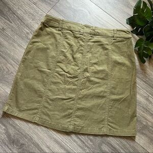 Aventura organic corduroy button front mini skirt in olive green. Size 4
