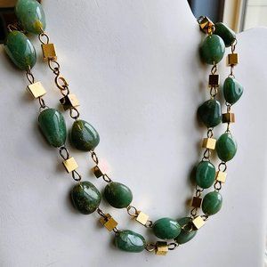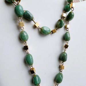 This vintage-made necklace has solid, genuine aventuring gemstone and goldtone cubes. It's 30 inches long for doubling and the gemstones run in the range of 3/4" by 1/2".