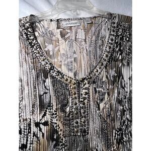 Chic and bold Avenue tunic-style blouse in size 26/28, featuring a striking mixed animal and paisley print in earthy tones. This top has a flattering v-neckline with embellishment detail, flowing pleated fabric, and lightweight feel—perfect for dressing up or down.