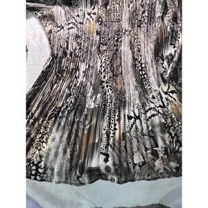 Chic and bold Avenue tunic-style blouse in size 26/28, featuring a striking mixed animal and paisley print in earthy tones. This top has a flattering v-neckline with embellishment detail, flowing pleated fabric, and lightweight feel—perfect for dressing up or down.