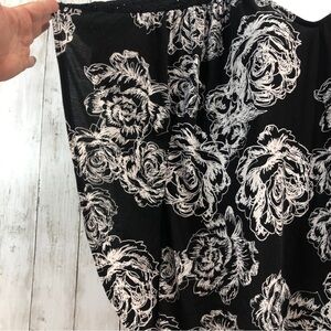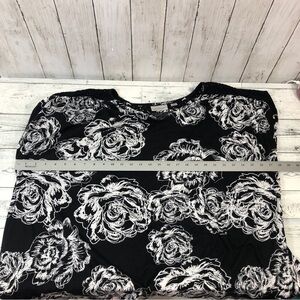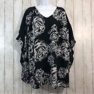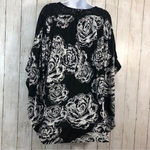 Black with white large flowers, batwing sleeves, lace on shoulders, curved hem, colors may vary due to lighting, good used condition, Sz: 26/28
