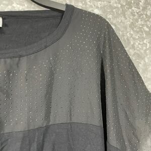 Women's plus size top by Avenue. This black top has a semi sheer yoke with small studs, short sleeves, and a jersey knit body. It is a viscose spandex blend with a polyester yoke.