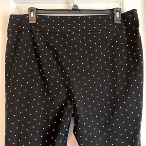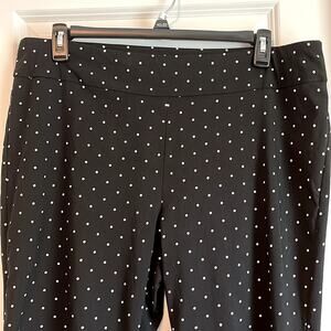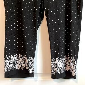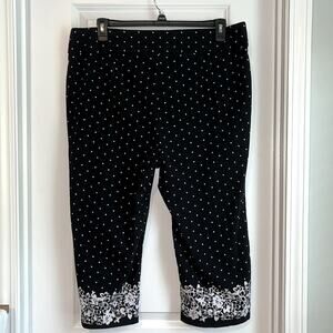 Avenue Black and White Polka Dot Crop Pants, size 18. White polka dots all over on black background, with white floral pattern at bottom of legs. Pull-on style, stretchy fabric.
