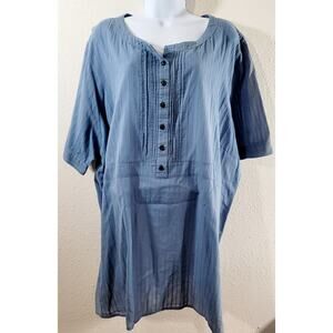 blue, henley, 1/2 button front, short sleeves, lightweight, soft, rounded hem, flowy, vented side seams. *NOTE: There is missing one button on bodice