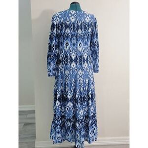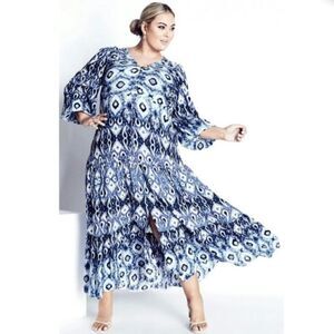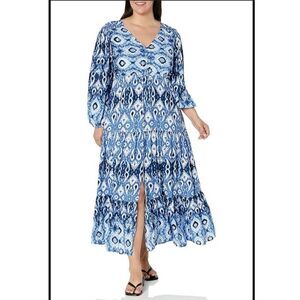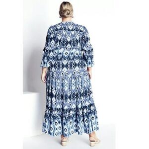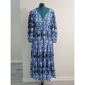Boho Avenue Elouise Relaxed Maxi Dress Geometric Print Heavyweight Blue and White Long Sleeves with Elastic End, Flowy Front Slit V Neck Button Front 100% Viscose Plus Size 16