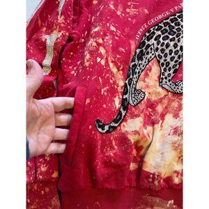 This vibrant Avenue George V Paris hoodie combines style and comfort with its unique red and bleach artwork pattern. The leopard design adds an artistic flair, making it a standout piece in any wardrobe. Crafted from 100% cotton, it offers a cozy fit ideal for casual outings. I believe it was embellished with Bleach dying. In good condition, missing a few rhinestones on the sleeves, see last photo. See photos for approximate flat measurements. Bleach artwork, streetwear, leopard, Goth, grunge