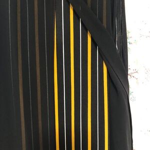 Black cap style outer layer with a shift dress underneath which is yellow white and black.