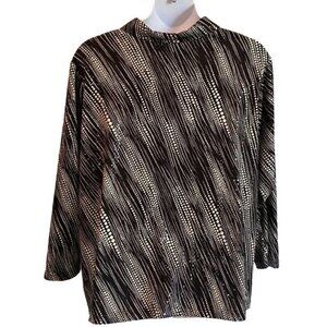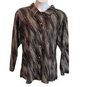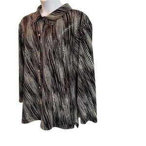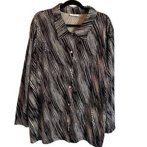 Avenue Long Sleeve Black and White Button Down Top with Sparkle. Missing size and fabric tags. I would estimate a 2X. Approximate Measurements laying flat: 31" pit to pit, 29" length.