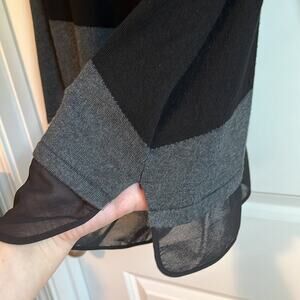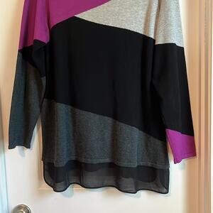 Avenue Long Sleeve Color Block Sweater, size 14/16. Light and charcoal gray, black and purple colors in color block pattern. Long sleeves, pull-on style, scoop neck, stretchy fabric. Attached sheer mesh edging at hemline front and back, with side slits.