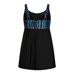 Material: 80% Nylon, 20% Elastane. Top Lining: 85% Nylon, 15% Elastane. Bottom Lining: 90% Polyester, 10% Elastane. Fabric has stretch. Scoop neckline Wide adjustable straps Supportive molded cups Pull-on style Empire waistline. Fit and flare silhouette Stretch fabrication Partial power mesh lining Full brief style with dress overlay Centre back measurement: 22 inches/56 cm. Style # 208253B BLACKPYTHON