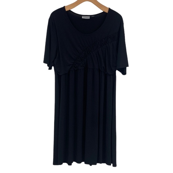 Avenue Midi Dress Women Size 26/28 Black Ruched Detail Flowy Short Sleeves Scoop Neckline. Stretchy Fabric. Relaxed Fit. 95% Polyester, 5% Spandex