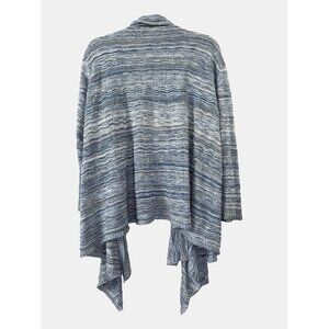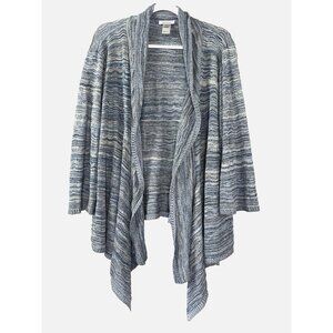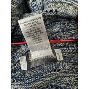 The Avenue Ocean Waves Blue Open Knit Open Front Card 2x Crochet Coastal Asy. Embrace coastal style with this beautiful open-knit cardigan from The Avenue. In a stunning "Ocean Waves Blue" color, this piece features a delicate crochet-style knit and a breezy open-front design. The asymmetrical hem adds a unique, draped silhouette, making it the perfect lightweight layer for a beach day, a casual stroll, or adding a touch of laid-back charm to any outfit. Pit to pit 19 inches. Length 38 inches. Made in USA. Good pre-loved condition.