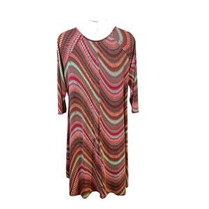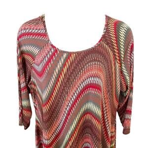 Step into effortless style with this bold and flattering Avenue high-low jersey knit dress in a rich red, olive, and bronze zigzag pattern. Designed in a comfortable 3/4 sleeve silhouette, this piece offers both movement and polish, making it a versatile wardrobe staple.