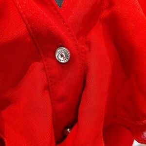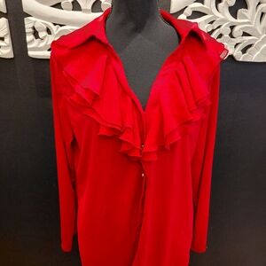 Vibrant red button-front blouse with layered ruffle detail at the placket. Classic collar and long sleeves. Lightweight, flowy fabric for versatile styling.