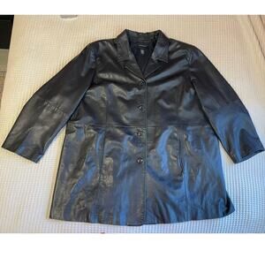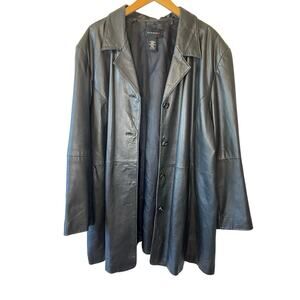 Avenue Soft Genuine Leather Black Collared Button Up Long Plus Size Jacket 22/24