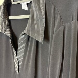 Stylish Avenue top with black base and pinstriped collar and cuffs. Stretch fabric for comfort. In good used condition. Size 26/28.