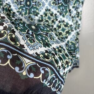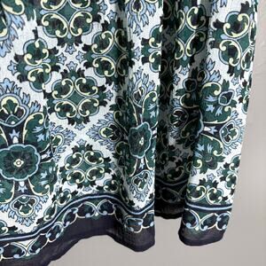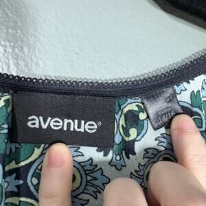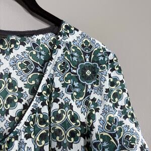 Women's plus size y2k peasant blouse by Avenue. This teal, white, and black patterened babydoll top has an elastic empire waist, a v-neck, and short sleeves. It is 100% polyester.