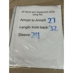 Flat measurements (approximate): Armpit to Armpit 27", Length from back 32", Sleeve 24"