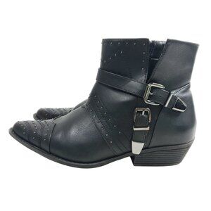 These refined ankle boots combine edgy style with professional sophistication. Crafted from soft black faux leather, the boots feature subtle studded detailing and strategic buckle straps that add architectural interest to a classic silhouette. (TU25)