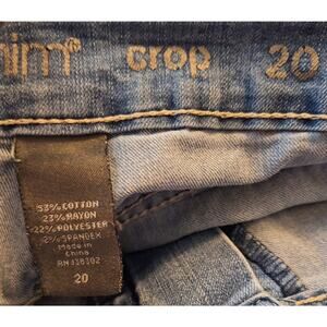 Avenue Denim, Women 20W, Medium Wash, Button/Zipper Closure, 5 Functional Pockets, Floral Embroidered Detail, Distressed, Cropped Length, Stretch Denim Jeans