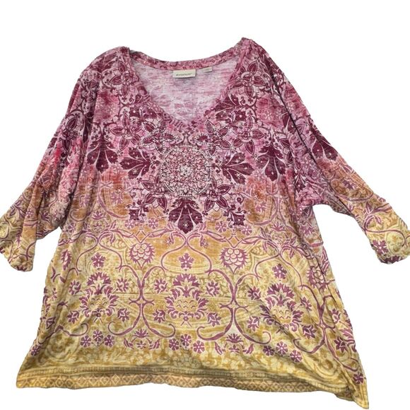 Avenue Womens Plus 30/32 All Over Print 3/4 Sleeve Top V Neck Art To Wear